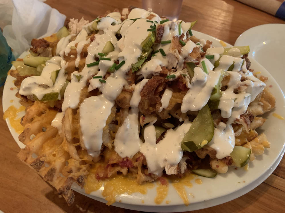 The reason we stopped was for their ridiculous snackage. First, we ordered a pile of Nachos Grande. They weren’t actually nachos. They were a pile of waffle fries piled high with cheese, bacon, fried chicken, pickles, and a few other things thrown in.