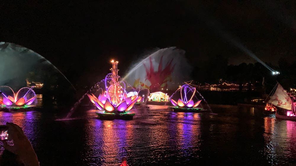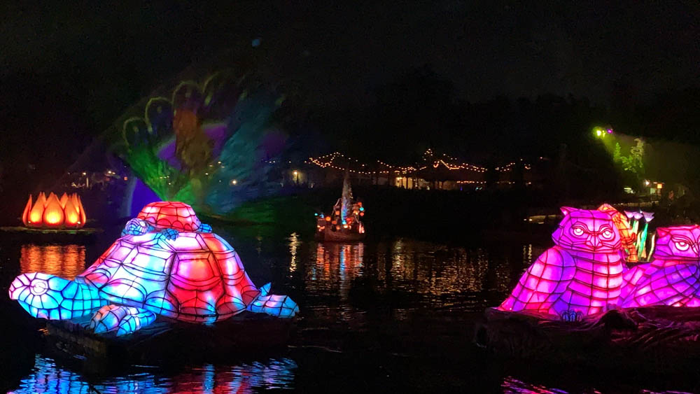 The final spectacle tonight was the parade of lights. I appreciate that their imagineers worked around the limits — not using certain effects and fireworks because of all of the live animals in the park. Their use of water and boat sails as projection screens and impressive lighting was impressive.